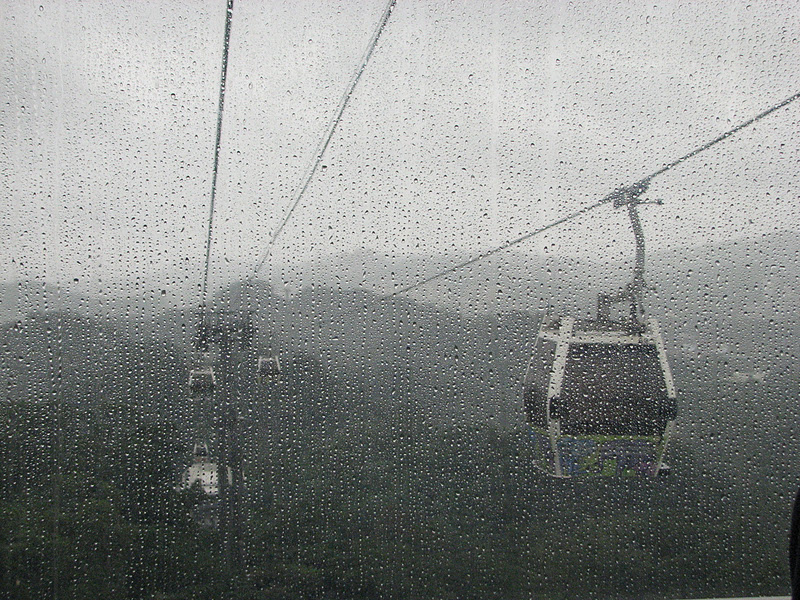 Maokong is one of Taiwan's oldest tea-growing areas and is famous for teahouses, temples and romantic night views of the city. On my first trip here we came shortly before New Years 2008 and could faintly make out Taipei 101 in the distance while the family played cards and drank tea. We ate some lunch in Maokong before heading back down since it would not have been fun walking up the rural mountain street in search of a teahouse in the rain. On the way back down we got a car with a glass floor! In this view the glass wasn't be covered in raindrops.